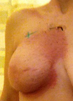 This gallery will contain photos that show the effects of radiation on my breast implant and my skin. Radiation can alter the shape, size, and consistency of breast implants and can cause pretty significant “sunburns”. This gallery will show the progress of the changes.